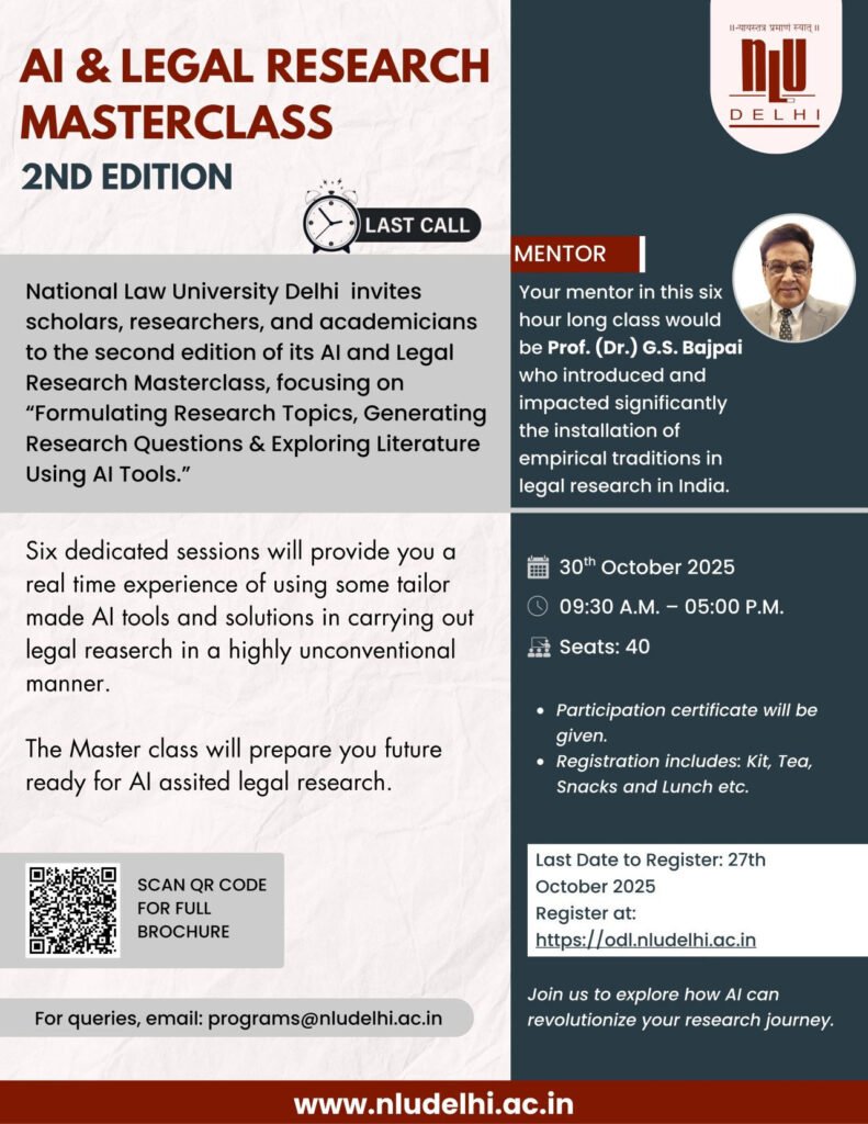 Following the success of its first edition, the AI and Legal Research Masterclass (2nd Edition) by NLU Delhi returns with an even more comprehensive and practical curriculum. Scheduled for 30 October 2025, this full-day offline masterclass will explore the intersection of law and artificial intelligence, providing participants with practical tools and conceptual understanding to use AI in legal research, drafting, and analysis.