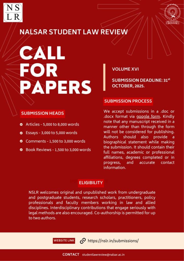 The Call for Papers for Volume XVI of the NALSAR Student Law Review (NSLR) invites submissions on a wide range of contemporary legal and interdisciplinary topics. The journal seeks to publish high-quality academic work that contributes to legal scholarship and addresses pressing issues in constitutional law, public policy, human rights, international law, commercial law, technology law, and other emerging areas.