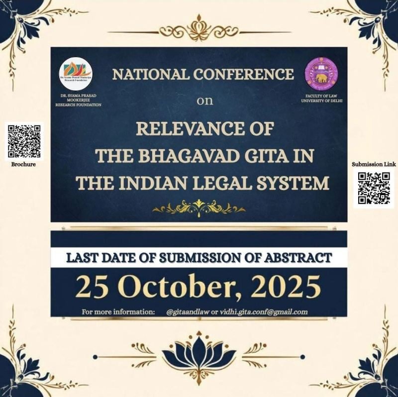 The National Conference on “The Relevance of Bhagavad Gita in Indian Legal System” aims to explore the profound influence of the Bhagavad Gita on principles of law, justice, rights, and duties. Organized jointly by the Faculty of Law, University of Delhi, and the Dr. Syama Prasad Mookerjee Research Foundation (SPMRF), this three-day academic event seeks to recontextualize the teachings of the Gita within the framework of Indian constitutionalism and contemporary legal thought.