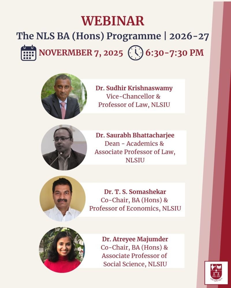 This webinar for NLS BA (Hons) aspirants will serve as an open platform to understand how the programme equips students with a strong foundation in humanities, social sciences, and law — preparing them for global opportunities in governance, diplomacy, and legal research.