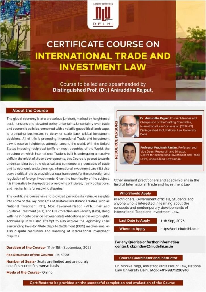 NLU Delhi is pleased to announce its Online Certificate Course on International Trade and Investment Law, scheduled from 11th – 15th September 2025.