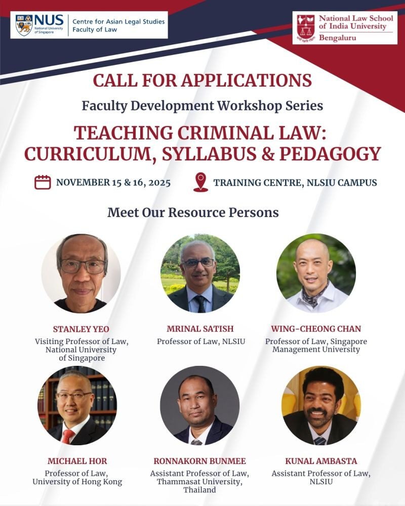 In this pursuit, NLSIU has launched the Faculty Development Workshop Series, aimed at strengthening academic capacity among law teachers and educators across India. The inaugural program in this series is the Teaching Criminal Law Workshop, organized in partnership with the Centre for Asian Legal Studies (CALS) at the National University of Singapore (NUS Law).