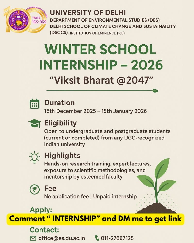 The Winter School Internship 2026 at University of Delhi is an on-campus internship program designed to impart research-based learning and practical exposure in the fields of environmental science, climate change, and sustainability studies.